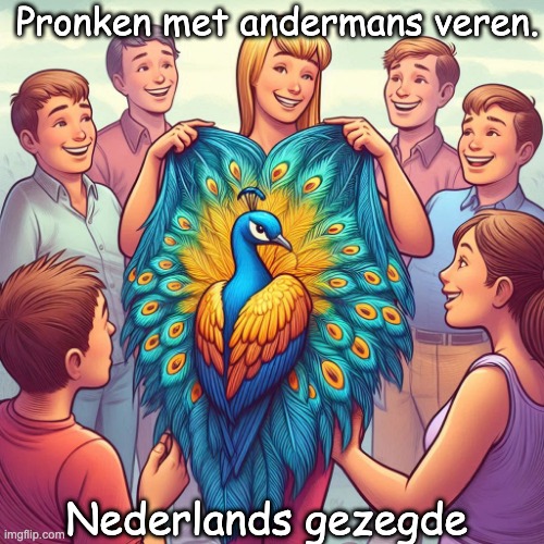 Afbeelding: Peter van Geest. Betekenis✅ : Opscheppen met iets dat je niet zelf hebt gedaan of verdiend, of eer/credits nemen voor het werk, de prestatie of bezittingen van iemand anders. Het heeft vaak een negatieve bijklank: het suggereert oneerlijkheid of aanstellerij. 🧠 Oorsprong: De uitdrukking gaat terug op een klassieke fabel, meestal toegeschreven aan Aesopus (Ezopus). In die fabel: Een kauw (of soms een andere vogel) steekt zich in de veren van een pauw (of andere opvallende veren). Hij probeert daarmee indruk te maken en als “bijzonder” door te gaan. Uiteindelijk wordt hij ontmaskerd en verliest hij status (en vaak ook letterlijk de veren).🔎 Waarom “veren”?: Veren (zeker pauwenveren) stonden symbool voor pracht, status en uiterlijk vertoon. De metafoor is dus: je tooit je met andermans glans. ✍️ Auteur: Dit is geen citaat van één specifieke auteur, maar een vaste uitdrukking / spreekwoord. De oorsprong in verhaalvorm ligt bij: Aesopus (Ezopus) als klassieke bron (fabeltraditie) 📜 . In de Europese literatuur is het motief later ook bekend geworden via bewerkingen, o.a.: Phaedrus (Latijnse fabelbewerker). Later ook in diverse Europese fabelbundels (o.a. La Fontaine-achtige tradities), maar de kern is ouder. Kortom: de uitdrukking is volks/taalkundig, en de bekendste oorsprong is de fabel van Aesopus. 🗣️ Voorbeelden (kort en duidelijk):“Hij deed alsof hij het project had geleid, maar hij pronkte met andermans veren.” “Zij kreeg alle lof voor het ontwerp—typisch pronken met andermans veren.” 📚 Extra (verwante uitdrukkingen): “Met de eer gaan strijken”, “Iemands werk/verdienste inpikken”, “Pluimen op zijn hoed steken” (kan neutraal/positief zijn, maar lijkt erop).