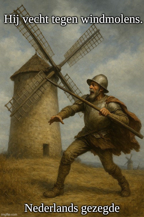 Afbeelding: Peter van Geest AI. Betekenis: Strijden tegen ingebeelde vijanden. Energie steken in een onhaalbare of zinloze strijd. Een probleem zien dat er niet werkelijk is. Idealisme dat botst met de realiteit. Het wordt vaak gebruikt voor iemand die hard werkt tegen iets dat niet te veranderen is, of die het probleem verkeerd inschat. Oorsprong: Komt rechtstreeks uit de beroemde Spaanse roman Don Quichot (El ingenioso hidalgo Don Quijote de la Mancha) van Miguel de Cervantes, gepubliceerd in 1605 (deel I) en 1615 (deel II). In een van de bekendste scènes ziet Don Quichot in de verte windmolens en denkt dat het reuzen zijn. Hij bestormt ze, raakt verstrikt in de wieken en wordt omvergeslagen.
