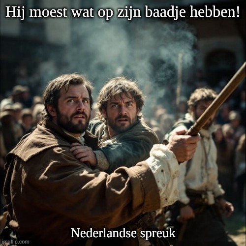 Afbeelding: Peter van Geest AI. Betekenis: “Op zijn baadje krijgen” betekent slaag krijgen, ervan langs krijgen, of een nederlaag lijden. De uitdrukking “Hij moest wat op zijn baadje hebben” betekent dus dat iemand slaag of een tik verdiende, of dat hij zijn straf moest krijgen. Oorsprong: Het woord “baadje” komt uit het Maleis “badjoe”, dat een soort gestreept hemd of buisje aanduidt. Dit was een kledingstuk dat in Nederlands-Indië werd gedragen. Het woord raakte ingeburgerd in het Nederlandse taalgebruik, vooral in maritieme kringen waar het baadje deel uitmaakte van het uniform van zeelieden.