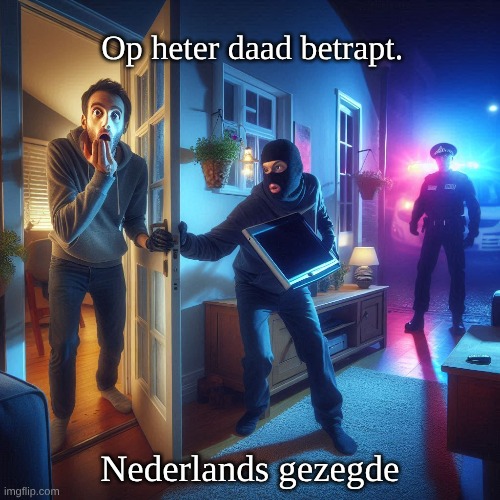 Afbeelding: Peter van Geest AI. Betekenis: “Heterdaad” is een juridisch begrip: het gaat om de ontdekking van een misdrijf op het moment dat het wordt gepleegd of onmiddellijk erna, wanneer het bewijs nog letterlijk “heet” is (de daad is nog niet “afgekoeld”). “Op heterdaad betrapt” wordt in het dagelijks taalgebruik breder gebruikt voor elke situatie waarin iemand op het moment van een fout, overtreding of ongemakkelijke handeling wordt gesnapt (bijvoorbeeld bij diefstal, spieken, overspel of liegen). Oorsprong: Het zelfstandig naamwoord “heterdaad” komt uit de samenstelling “hete daad”: een oude datiefvorm van “hete” en “daad”, waarmee letterlijk wordt bedoeld dat de handeling nog “warm” of vers is. Het element “heter-” is dus geen verwant van “hetero-” uit het Grieks, maar een verouderde vorm van “hete”; via vaste juridische formules raakte deze vorm versteend in het Nederlands rechtstaalgebruik en bleef zo in de uitdrukking bewaard.