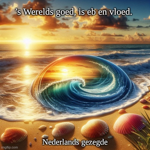 Afbeelding: Peter van Geest AI. Betekenis: Het leven gaat op en neer; voorspoed en tegenspoed wisselen elkaar voortdurend af. Oorsprong: Dialectisch volksgezegde (waarschijnlijk Zeeuws / West-Vlaams gebied). Auteur: anoniem, zeker niet aantoonbaar, zoals vaak beweerd Guido Gezelle.