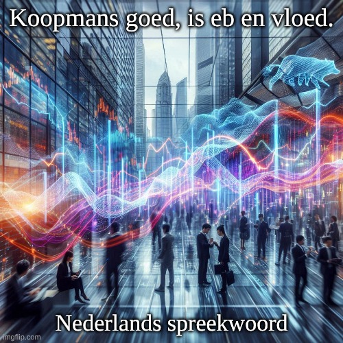 Afbeelding: Peter van Geest AI. Betekenis: Ondernemers hebben vaak te maken met goede en slechte tijden. Net zoals eb en vloed elkaar afwisselen in een natuurlijk ritme, zo kent de handel periodes van voorspoed en tegenslag. Het handelskapitaal en de omzet gaan op en neer, vergelijkbaar met het stijgen en dalen van de zee. Oorsprong: Oud Nederlands spreekwoord dat zijn wortels heeft in de maritieme geschiedenis van Nederland. De metafoor van eb en vloed was voor Nederlanders – als zeevarend handelsvolk – een voor de hand liggende vergelijking voor de wisselende fortuin in de koophandel.
