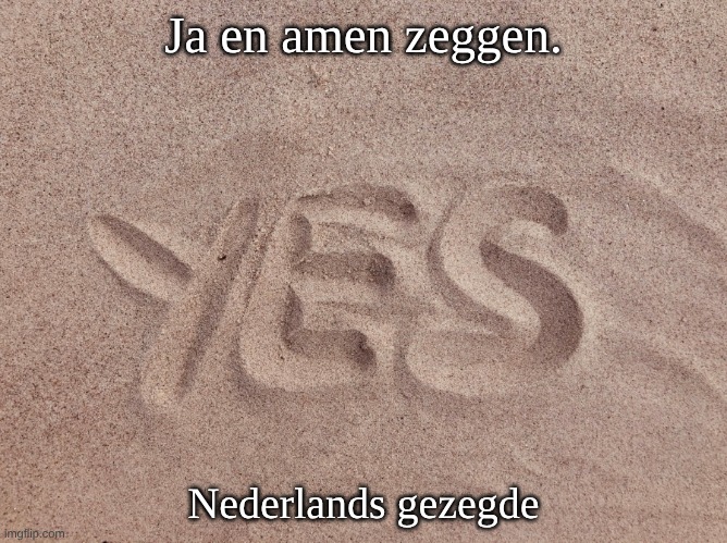 Foto: justlive. Betekenis: Zonder tegenwerping alles goedvinden, kritiekloos instemmen, alles accepteren wat iemand zegt of besluit. Oorsprong: De uitdrukking komt uit de christelijke liturgie. In kerkdiensten bevestigt de gemeente na gebed of geloofsbelijdenis met “Amen” — een Hebreeuws woord dat betekent: zo is het, zo zij het, het is waar. Het “ja” verwijst naar het bevestigend instemmen. Gecombineerd ontstond de formulering “ja en amen zeggen” als beeld voor volledig akkoord gaan, zonder iets tegen te houden. De beeldspraak is al vroeg in de Nederlandse taal terug te vinden (17e eeuw en later) in religieuze en morele teksten. Er is geen individuele auteur: het is een traditioneel spreekwoord dat uit de religieuze context in de algemene taal is overgenomen.