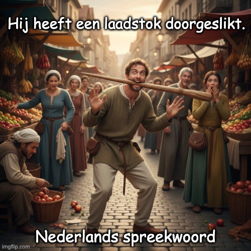 Afbeelding: Peter van Geest AI. Betekenis:Letterlijke: De zin verwijst naar iemand die letterlijk een laadstok (een soort houten stok of staaf) heeft ingeslikt, wat gevaarlijk en ongebruikelijk is. Figuratieve betekenis: In de spreektaal kan deze uitdrukking ook betekenen dat iemand zich in een onhandige, domme of benarde situatie heeft gebracht, of dat iemand zich op een vreemde manier gedraagt. Oorsprong: De oude laadstok is een houten stok die vroeger werd gebruikt bij het laden van goederen, bijvoorbeeld in schepen of karren. Deze stok was lang, recht en stevig, en werd gebruikt om ladingen te verplaatsen of te ondersteunen. Het gezegde verwijst dus naar deze harde, rechte stok, niet naar de moderne elektrische laadstok (zoals een laadpaal voor elektrische auto’s). Er is geen specifieke auteur verbonden aan deze uitdrukking, aangezien het een gezegde is dat waarschijnlijk in de loop der tijd is ontstaan en overgeleverd in de Nederlandse taal.