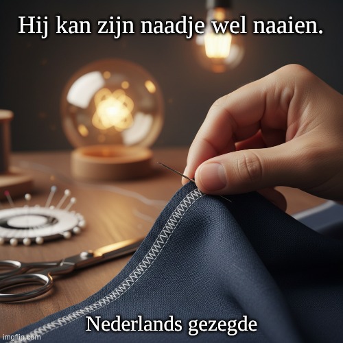 Afbeelding: Peter van Geest AI. Betekenis: Iemand is slim of bekwaam en goed in staat om voor zichzelf te zorgen. Het geeft aan dat iemand in staat is om problemen op te lossen of situaties goed te beheren. Oorsprong: Deze uitdrukking is een typisch Nederlands gezegde dat voortkomt uit de ambachtelijke praktijk van naaien. Het verwijst naar de vaardigheid om naadjes goed te kunnen naaien, wat een teken is van precisie en vaardigheid. Het gebruik van naaien als metafoor voor bekwaamheid is een veelvoorkomend thema in verschillende talen en culturen. Auteur: Er is geen specifieke auteur aan deze uitdrukking verbonden, aangezien het een volkswijsheid is die door de tijd heen in de Nederlandse taal is ontstaan. Het is een deel van de Nederlandse spreekwoorden en gezegden die vaak in de dagelijkse communicatie worden gebruikt. Extra Informatie: Dit soort uitdrukkingen worden vaak gebruikt in gesprekken om iemands capaciteiten of slimheid te benadrukken. Het is een positieve opmerking die de vaardigheden van een persoon erkent.