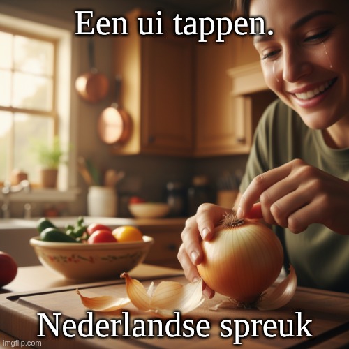 Afbeelding: Peter van Geest AI. Betekenis: Een mop vertellen, letterlijk zo dat het in gezelschap de tranen over de wangen rollen, alsof men een ui pelt. Oorsprong: Studentenuitdrukking.