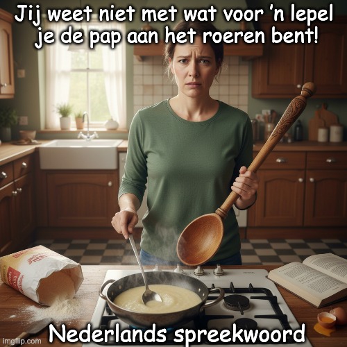 Afbeelding: Peter van Geest AI. Betekenis: Deze uitdrukking verwijst naar het onbewust zijn van de middelen of middelen die je gebruikt in een bepaalde situatie, en de gevolgen die daaruit voortvloeien. Oorsprong:Volkswijsheid: De spreuk is een voorbeeld van een volkswijsheid die in de Nederlandse taal is ontstaan. Het gebruik van de lepel in combinatie met pap symboliseert alledaagse handelingen en de impact daarvan. Taalgebruik: De uitdrukking is waarschijnlijk ontstaan in een tijd waarin koken en het bereiden van voedsel een centrale rol speelde in het dagelijks leven. De spreuk is een krachtige metafoor voor onbewust handelen en de gevolgen daarvan, maar de exacte oorsprong of eerste publicatie blijft onduidelijk.