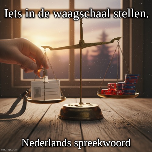 Afbeelding: Peter van Geest AI. Betekenis: Iets bewust riskeren of op het spel zetten, vaak met een groot belang. Oorsprong: Waagschaal is een oudere/archaïsche vorm van weegschaal (balansweegschaal met twee schalen). Beeld: je legt “iets” op de schaal, waardoor de balans kan kantelen — je waagt het, het kan goed of slecht uitpakken. Als vaste uitdrukking al sinds de vroegmoderne tijd (17e eeuw) in het Nederlands in gebruik; verwant aan het Duitse “etwas in die Wagschale werfen/stellen”. “Waagschaal” leeft vandaag vooral voort in deze vaste zegswijze; in het dagelijks taalgebruik zeggen we “weegschaal”. Auteur: Geen specifieke auteur. Het is een traditionele uitdrukking/spreekwoordelijk gezegde die organisch uit het taalgebruik is ontstaan en historisch in woordenboeken en teksten is vastgelegd.