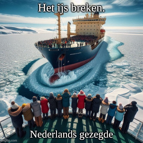 Afbeelding: Peter van Geest AI. Betekenis: Nederlandse uitdrukking die betekent: een gesprek beginnen of de sociale spanning in een groep verminderen. Het wordt vaak gebruikt in situaties waar mensen elkaar nog niet goed kennen of wanneer er een ongemakkelijke sfeer heerst. Oorsprong: De uitdrukking komt voort uit de metafoor van het breken van ijs om toegang te krijgen tot een open water. In sociale context verwijst het naar het doorbreken van de eerste onwennigheid tussen mensen. Auteur: Deze uitdrukking is geen citaat van een specifieke auteur, maar eerder een algemeen gebruikte gezegde in de Nederlandse taal. Het is een deel van de Nederlandse cultuur en wordt vaak gebruikt in sociale interacties.