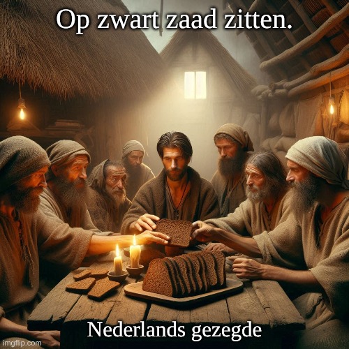 Afbeelding: Peter van Geest AI. Betekenis: Nederlands gezegde dat betekent: “Broke zijn” of “Geen geld meer hebben.”Oorsprong: De oorsprong van dit gezegde ligt in de landbouw: Zwart zaad verwijst naar zaden die niet meer kunnen groeien of geen opbrengst meer leveren. Het idee is dat wanneer iemand “op zwart zaad zit,” ze in een situatie zijn waarin ze geen middelen meer hebben om verder te gaan, vergelijkbaar met een boer die geen gewas meer kan oogsten. Alternatieve uitleg: Geen geld meer hebben. Mogelijk te verklaren uit het feit dat vroeger arme mensen geen wittebrood konden betalen en daarom (zwart) roggebrood aten. Ook: Betekenis: Hij is arm, zijn geld is op. Oorsprong: Gezegd van vogels in een kooi, die alleen nog maar zwart zaad hebben; ze pikken er namelijk eerst de witte korrels uit. Auteur: Dit gezegde heeft geen specifieke auteur, aangezien het een deel is van de Nederlandse spreektaal en door de tijd heen is ontstaan. Het is dus een traditioneel gezegde dat door generaties heen is doorgegeven.