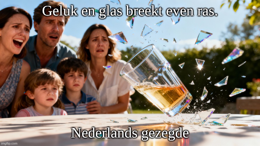 Afbeelding: Peter van Geest AI. Betekenis: De kernbetekenis: geluk is broos en van korte duur; wat je nu hebt, kun je zomaar kwijt zijn, net zoals een glas zo uit je handen kan vallen en in scherven uiteen kan spatten. In het gebruik klinkt vaak een mengeling van nuchterheid en waarschuwing mee: geniet, maar wees je bewust dat voorspoed niet vanzelfsprekend en niet blijvend is. Oorsprong: Er is geen bekende bedenker of auteur; het geldt als anoniem spreekwoord, net als vele andere Nederlandse zegswijzen uit vroeg‑moderne of oudere tijd.