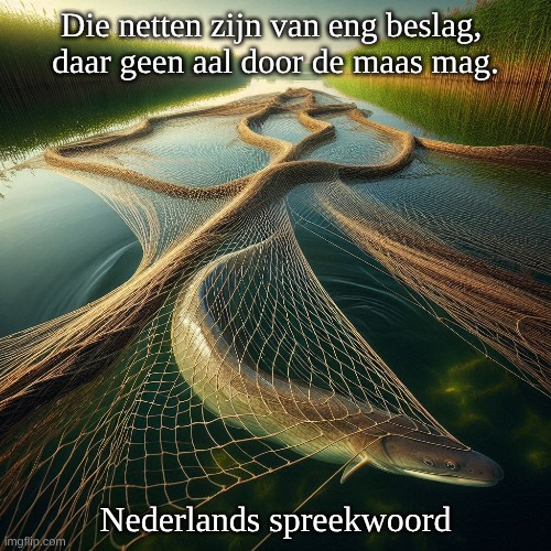 Afbeelding: Peter van Geest AI. Betekenis: De uitspraak verwijst naar regels of voorschriften die zeer strikt zijn. Het idee is dat zelfs kleine uitzonderingen (vergeleken met aal) niet door de mazen van de regels kunnen glippen. Oorsprong: Deze uitspraak is een Nederlands gezegde dat vaak gebruikt wordt om de strengheid van bepaalde regelgeving of normen aan te duiden. Het gebruik van visnetten als metafoor geeft aan dat zelfs de kleinste dingen niet ontsnappen aan de controle. Auteur: De specifieke auteur van dit citaat is niet algemeen bekend. Het lijkt meer een traditioneel gezegde te zijn dat in de Nederlandse cultuur is ontstaan en door de jaren heen is doorgegeven. Opmerking: Dit gezegde kan worden toegepast in verschillende contexten, zoals wetgeving, sociale normen of zelfs in bedrijfsregels, waar het benadrukken van strikte naleving belangrijk is.