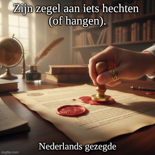 Afbeelding: Peter van Geest AI. Betekenis: De uitdrukking verwijst naar het bevestigen of goedkeuren van iets, vaak in een formele context. Het idee van een zegel symboliseert autoriteit en legitimiteit, zoals het goedkeuren van documenten of overeenkomsten. Oorsprong: Deze uitdrukking komt voort uit de traditie waarbij een zegel (zoals een waszegel) werd gebruikt om documenten te authenticeren. Het gebruik van zegels gaat terug tot de oudheid en was een manier om de identiteit van de ondertekenaar te bevestigen. Auteur: Er is geen specifieke auteur verbonden aan deze uitdrukking, aangezien het een algemeen gezegde is dat in de Nederlandse taal wordt gebruikt. Het behoort tot de bredere culturele en linguïstische context van de Nederlandse taal en kan in verschillende documenten en situaties voorkomen. Toepassing: Deze uitdrukking kan vaak worden aangetroffen in juridische, zakelijke of administratieve teksten.