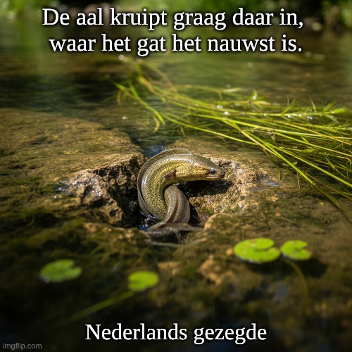 Afbeelding: Peter van Geest AI. Betekenis:Interpretatie: Dit gezegde verwijst naar de neiging van mensen om vaak de moeilijkste of meest uitdagende weg te kiezen. Het suggereert dat men soms de voorkeur geeft aan situaties die complex of riskant zijn. Oorsprong:Culturele context: Dit gezegde is een traditioneel Nederlands spreekwoord en weerspiegelt de wijsheid en observaties van het dagelijks leven. Het gebruik van de aal als metafoor benadrukt ook de sluwheid en het vermogen om zich aan te passen aan moeilijke omstandigheden. Auteur:Onbekend: Zoals veel spreekwoorden, is de exacte oorsprong en auteur vaak niet te traceren. Ze worden vaak doorgegeven door generaties en zijn een deel van de volkswijsheid. Conclusie: Dit spreekwoord is een interessante reflectie op menselijk gedrag en de keuzes die we maken, vaak in het licht van uitdagingen. Het gebruik van dieren in spreekwoorden maakt ze levendig en herkenbaar. 🐍