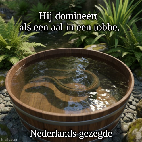Afbeelding: Peter van Geest AI. Betekenis: De uitdrukking beschrijft iemand die zeer goed de controle heeft over een situatie. Het beeld van de aal in een tobbe (een soort vat) illustreert de vrijheid en soepelheid waarmee iemand zich kan bewegen en opereren in een bepaalde context. Oorsprong: De oorsprong van deze uitdrukking is niet precies te traceren, maar het gebruik van dieren in metaforen is een veelvoorkomend kenmerk in de Nederlandse taal. De vergelijking met een aal, die bekend staat om zijn glibberigheid en behendigheid, versterkt het idee van dominantie en controle. Auteur: Er is geen specifieke auteur bekend voor deze uitdrukking. Het is een volkswijsheid die door de jaren heen in de Nederlandse cultuur is ontstaan en gebruikt.