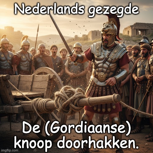 Afbeelding- Peter van Geest AI. Betekenis: Een ingewikkeld, vastgelopen probleem oplossen door een krachtige, directe beslissing te nemen, vaak zonder alle details stap voor stap uit te pluizen. Connotatie: daadkracht en besluitvaardigheid 💪, soms ook: onconventioneel of “met een omweg” oplossen. 🧠 Oorsprong (mythologisch-historisch): De uitdrukking komt uit de Griekse oudheid en is verbonden aan de stad Gordion (in het oude Frygië, in het huidige Turkije). Volgens de legende stond daar een wagen met een extreem ingewikkelde knoop (de Gordiaanse knoop) die bevestigd was aan de dissel.. Er was een voorspelling: wie de knoop kon losmaken, zou heerser over Azië worden. ⚔️ Wie “hakte” de knoop door? Dat was Alexander de Grote (356–323 v.Chr.) 👑. In plaats van de knoop netjes te ontwarren, zou hij: de knoop met zijn zwaard hebben doorgehakt. Daarmee loste hij het probleem op in één krachtige actie—precies het idee van het gezegde. (Er bestaan varianten van de overlevering: sommige bronnen suggereren dat Alexander de knoop “slim” losmaakte door een pen/wig los te trekken. Maar de klassieke versie is: doorhakken met het zwaard.) ✍️ Auteur: Er is geen “auteur” in de zin van één persoon die het gezegde heeft bedacht. Het is een idioom dat in de Europese talen is gegroeid vanuit de klassieke overlevering. De bekendste antieke schrijvers die het verhaal (in varianten) doorgeven zijn o.a.: Arrianus (Anabasis Alexandri) 📜, Plutarchus (Vita Alexandri) 📜, Quintus Curtius Rufus (Historiae Alexandri Magni) 📜. ➡️ Dus: Alexander de Grote is de historische figuur die het “doen” van de handeling (in de legende) toeschreven krijgt, maar de uitdrukking zelf is later als zegswijze ingeburgerd geraakt. 🧩 Kort voorbeeldgebruik: “De onderhandelingen zaten muurvast, dus de directeur hakte de Gordiaanse knoop door en koos meteen voor plan B.”