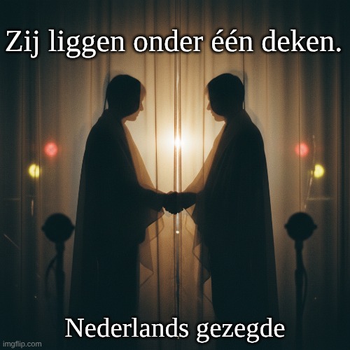 Afbeelding: Peter van Geest AI. Betekenis 📌:Figuurlijk: Ze zijn nauw met elkaar verbonden of spelen onder één hoedje; vaak met de bijbetekenis van samenspannen, belangenverstrengeling of een te innige, niet-onafhankelijke relatie. Letterlijk: Ze liggen onder dezelfde deken (alleen in concrete context). Connotatie en gebruik 🧭: Meestal negatief of kritisch (politiek, bedrijfsleven, toezicht, media). Register: Gangbaar in spreektaal en journalistiek; in formele teksten beter vervangen door neutralere termen zoals “nauwe banden hebben” of “er is sprake van belangenverstrengeling”.Herkomst (etymologie) 🧵:Oorsprong: Geen specifieke bron of bedenker; het is een spreekwoordelijke uitdrukking uit het Nederlands. Beeld: Het delen van één deken staat symbool voor intimiteit/verbondenheid en dus (te) nauwe samenwerking. Het schijnt in de middeleeuwen gebruikelijk te zijn geweest dat twee personen, die hetzelfde beoogden, samen onder een deken sliepen, voornamelijk wanneer het bijeenkomsten gold, waarveel wapenbroeders e.d. op een slot bijeen waren. Parallellen: Vergelijkbaar met het Duitse “unter einer Decke stecken,” wat wijst op een breder Germaans beeld. Exacte datering is niet vast te pinnen; de uitdrukking circuleert al geruime tijd in de standaardtaal. Auteur ✍️:Geen. Het is een vaste uitdrukking/idioom zonder individuele auteur.