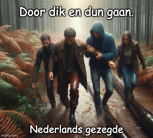 Afbeelding: Peter van Geest AI. Betekenis 🧭: Onvoorwaardelijk steunen; trouw blijven in goede én slechte tijden. Voorbeelden: “Ze gingen voor hem door dik en dun tijdens de campagne.” “Hij verdedigt zijn ploeg door dik en dun.”Oorsprong 📜: Germaanse uitdrukking met het letterlijke beeld van reizen “door dik en dun” terrein: door dicht struikgewas (dik) en open stukken (dun) — dus: onder alle omstandigheden. Ontleend aan de kwajongens, die graag door de modderigste wegen en de grootste plassen gaan. Bestaat in meerdere talen: Nederlands: Door dik en dun. Engels: Through thick and thin (al vroeg modern, bijv. 16e–17e eeuw). Duits: Durch dick und dünn. Het is een oud, traditioneel gezegde; geen moderne coinage. Auteur ✍️:Geen specifieke auteur. Het is een volks/spreektaal-uitdrukking die historisch gegroeid is. Gebruik en varianten 🗣️: Vaak met werkwoorden als: Iemand door dik en dun steunen / verdedigen; trouw blijven; voor iemand door dik en dun gaan. Register: Neutraal, veelgebruikt in zowel spreek- als schrijftaal.