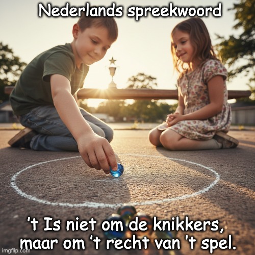 Afbeelding: Peter van Geest AI. Betekenis 🎯:Kern: Het gaat niet om de opbrengst/winst (“de knikkers”), maar om het principe, de regels en de eerlijkheid waarmee gespeeld of gehandeld wordt (“het recht van ’t spel”). Nuance: “…om het spel” = nadruk op het proces/mee doen. “…om het recht van ’t spel” = nadruk op fair play, rechtsstatelijke / procedurele zuiverheid. Oorsprong 📜: Het is een Nederlandse zegswijze die uit het kinderbeeld van knikkeren stamt: niet de buit (knikkers) telt, maar het eerlijk volgen van de spelregels. De variant met “het recht van ’t spel” is vooral in de 20e eeuw populair geworden in politieke en juridische contexten om te benadrukken dat procedures en rechtsstatelijke waarborgen zwaarder wegen dan kortetermijnresultaten. Er is geen vaststaande eerste bron of gedocumenteerde “eerste gebruik” in druk; de uitdrukking circuleert al decennialang in varianten. Auteur / Toeschrijving 👤: Geen eenduidige, verifieerbare auteur. Het geldt als een gemeenzame uitdrukking/gezegde. In politieke en juridische toespraken is het vaker aangehaald; het wordt soms aan verschillende politici of juristen toegeschreven, maar zonder harde primaire bron. Kortom: geen definitieve auteur bekend. Varianten en nuance 🧩:“Het gaat niet om de knikkers, maar om het spel.” (algemeen, focus op deelnemen / proces) “Het gaat niet om de knikkers, maar om het recht van ’t spel.” (specifieker, focus op eerlijkheid en rechtsbeginselen). Nabije betekenis: “Het gaat om het principe, niet om de opbrengst.”Gebruik in context 💬:Politiek/juridisch: discussies over procedures, democratische spelregels, due process. Sport: het belang van fair play boven winnen tegen elke prijs. Onderwijs/werk: integriteit en naleving van regels boven alleen targets halen. Vertaling 🌍: Letterlijk (EN): “It’s not about the marbles, but about the right/fairness of the game.” Idiomatisch (EN): “It’s not about the spoils, but about fair play” / “It’s the principle and the rules that matter, not the takings.”
