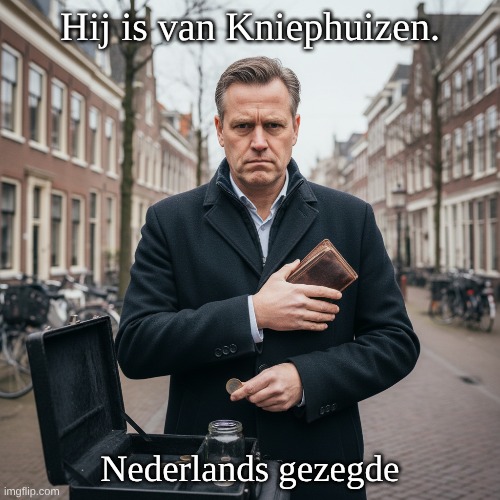 Afbeelding: Peter van Geest AI. Betekenis: Hij is gierig. Oorsprong: Kniephuizen is een dorpje in Oost Friesland. De uitdrukking is vooral in Groningen gangbaar omdat een heer van Kniephuizen (Von Inn-und Knyphausen) trouwde met de rijke erfdochter Anna van Ewsum op Nienoord bij Midwolde in ’t Westerkwartier. Na zijn dood trouwde zij met zijn neef. Beide Kniephuizens zijn in mamrmer vereeuwigd door Rombout Verhulst in de graftombe in de Midwolder kerk.