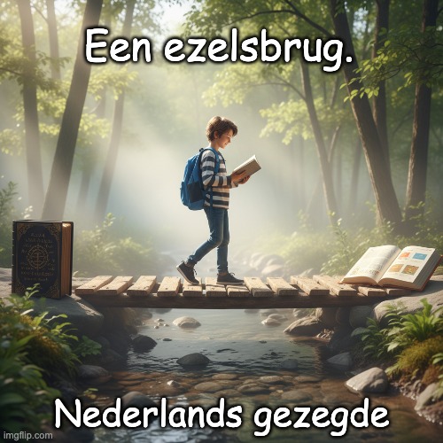 Afbeedling: Peter van Geest AI. Betekenis: Een hulpmiddel om iets gemakkelijk te onthouden of van buiten te leren. Vertaling van het Latijnse pons asinorum. Oorsprong: Ezels zijn erg bang voor water en weigeren koppig om zelfs door de kleinste waterlopen te waden, zelfs als ze het fysiek gemakkelijk zouden aankunnen (“koppige ezel”), omdat een ezel door het reflecterende wateroppervlak niet kan zien hoe diep de beek is. Daarom werden er voor hen kleine bruggetjes gebouwd bij doorwaadbare plaatsen, bekend als “ezelsbruggetjes”. Analoog hieraan is een spreekwoordelijk ezelsbruggetje een omweg of speciale inspanning die toch sneller – of zelfs helemaal niet – naar de bestemming leidt. Bovendien zullen ezel niet elke brug oversteken, omdat ze hun hoeven alleen op grond zetten die hen volkomen veilig lijkt. Ze steken alleen bruggen over die hen veiligheid bieden. Het “ezelsbruggetje” staat dus ook voor veiligheid.