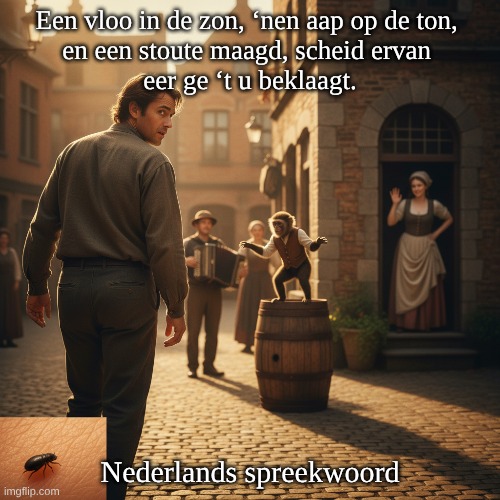 Afbeelding: Peter van Geest AI. 📌 Betekenis: Het rijm waarschuwt om op tijd afstand te nemen van verleidelijke maar riskante situaties—nog vóór ze je problemen bezorgen. Moderne parafrase: “Blijf er niet bij hangen; stap weg voordat je er spijt van krijgt.” ⚠️ 🧩 Uitleg van de beelden in de spreuk: De zin is dialectaal (Vlaams/Brabants aandoend) en werkt met drie “beelden” die elk iets aantrekkelijks maar potentieel lastigs oproepen: “Een vloo in de zon”; Vlo = vlo (parasiet). In de zon lijkt alles aangenaam / onschuldig, maar een vlo betekent uiteindelijk jeuk/last. Beeld: iets kleins dat eerst niet erg lijkt, maar later irritatie of schade geeft. “’nen aap op de ton”. Een aap op een ton verwijst naar kermis- of straatvermaak: grappig om te zien, maar ook symbool voor gekte, bedrog, lawaai of onnozel gedoe. Beeld: spektakel dat je aantrekt maar je in miserie kan trekken. “een stoute maagd”.“Stout” in oudere/regionale context = ondeugend, uitdagend, lichtzinnig (niet per se “slecht”, eerder: “gevaarlijk verleidelijk”). Beeld: erotische / romantische verleiding met mogelijk reputatieschade of spijt. “scheid ervan eer ge ’t u beklaagt”.Betekent: ga weg / neem afstand vóór je er spijt van hebt. 🕰️ Oorsprong: Dit type tekst is typisch voor volkswijsheden in rijmvorm: korte, ritmische regels die men mondeling onthield. 🗣️ De woordkeuze (‘nen, ge, ’t) wijst sterk op Zuid-Nederlandse dialectstreken (Vlaanderen/Brabant). Een exacte “eerste vindplaats” is zonder gerichte naslag moeilijk hard te maken, omdat zulke rijmspreuken: vaak decennialang mondeling circuleerden, later pas in spreekwoorden- en dialectverzamelingen werden opgetekend. ✍️ Auteur:Er is geen bekende individuele auteur die met zekerheid aan dit spreekwoord gekoppeld is. Het is vrijwel zeker anonieme volkswijsheid (collectief gegroeid en doorgegeven).