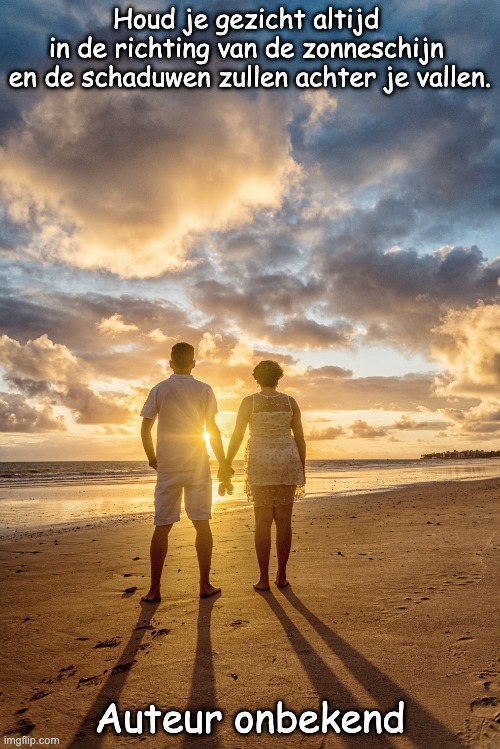 Foto: Diego Pontes. Betekenis 🌟:Positieve Focus: Het gezegde spoort mensen aan om hun aandacht te richten op de positieve en hoopvolle aspecten van het leven. Problemen Achterlaten: Door je op het “licht” (het positieve) te focussen, verdwijnen de “schaduwen” (problemen, zorgen of negatieve gedachten) figuurlijk uit je directe zicht en invloed; ze vallen “achter” je. Optimisme: Het is een metafoor voor een optimistische levenshouding. 🌱 Oorsprong:Vroege Vermeldingen: De vroegste varianten van dit gezegde doken al halverwege de 19e eeuw op. 1850: De Engelse dichter Charles Swain gebruikte vergelijkbare beeldtaal in een vers. 1862: De oudste, anonieme versie die is getraceerd, stond in een krant in West Virginia: “Face the sunshine, and your shadow will fall behind you.” Andere Versies: Ook Helen Keller gebruikte een zeer gelijkaardige variant in een poëziealbum: “Keep your face to the sunshine and you cannot see the shadow.”, maar het gezegde was toen al langer in omloop. ✍️ Auteur:Foutieve Toeschrijving: Hoewel dit gezegde vaak wordt toegeschreven aan Walt Whitman, is dit onjuist. Naamsverwarring: De Quote Investigator concludeerde dat dit waarschijnlijk het gevolg is van een verwarring. In 1903 werd een versie van het gezegde toegeschreven aan een zekere M. B. Whitman. Rond 1910 werd de achternaam “Whitman” gebruikt zonder initialen. Pas in 1919 werd de eer ten onrechte aan Walt Whitman gegeven.Conclusie: Het gezegde heeft geen éénduidige auteur. Het is in de loop van de 19e eeuw organisch ontstaan en geëvolueerd. Walt Whitman wordt er het vaakst mee geassocieerd, maar dat berust op een historische vergissing. De ware oorsprong is anoniem — wat het gezegde misschien des te universeler maakt.