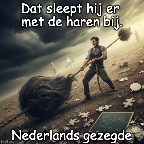 Afbeelding: Peter van Geest AI. Betekenis:Iets erbij slepen wat niet relevant is: Je haalt iets aan dat geen direct verband heeft met waar het eigenlijk over gaat. Een vergezocht argument: Het is een zwakke of kunstmatige poging om een punt te ondersteunen. Onnodige complexiteit toevoegen: Door irrelevante zaken erbij te halen, maak je een discussie onnodig ingewikkeld. Oorsprong 🧐: De exacte oorsprong van deze uitdrukking is niet helemaal duidelijk, maar de beeldspraak is vrij sprekend. Met de haren slepen: Stel je voor dat je iets tegen zijn natuur in, met veel moeite en op een onhandige manier ergens naartoe sleept. Dat is vergelijkbaar met hoe een vergezocht argument wordt “meegesleept” in een discussie. Het past niet vanzelf, dus moet het met “geweld” (met de haren) erbij worden gehaald. Visuele analogie: Het beeld van iemand die iets letterlijk aan de haren voorttrekt, geeft goed weer hoe forcerend en onnatuurlijk het kan zijn om een irrelevant punt in een gesprek te introduceren. Het suggereert een gebrek aan natuurlijke aansluiting of logica. Kortom, het is een pittige manier om aan te geven dat iemand zich bedient van een drogreden of een onterechte zijsprong in een discussie! 🗣️