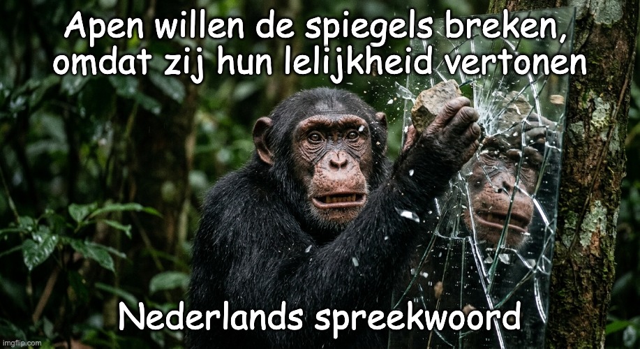 Afbeelding: Peter van Geest AI. Betekenis 🤔 🐒: De kernboodschap van dit citaat is vrij diepzinnig en gaat verder dan alleen de oppervlakte: Zelfconfrontatie: Het verwijst naar de menselijke neiging om de confrontatie met onze eigen tekortkomingen en onvolkomenheden te vermijden. Ontkenning: In plaats van onze ‘lelijkheid’ (of dit nu fysiek, moreel of persoonlijk is) onder ogen te zien, vallen we de ‘spiegel’ aan. De spiegel kan hier symbool staan voor kritiek, waarheid, of zelfs andere mensen die ons onze fouten tonen. Verdedigingsmechanisme: Het is een krachtig psychologisch verdedigingsmechanisme. Door de bron van de waarheid te vernietigen (de spiegel), hopen we de waarheid zelf te kunnen negeren. 🌱 Oorsprong: De ware oorsprong van dit citaat is een beetje mysterieus. Er zijn verschillende theorieën, maar de meest waarschijnlijke bron is niet een specifieke auteur, maar eerder een langdurige, culturele evolutie van ideeën. Oudste Bekende Vermelding: De oudst bekende vermelding van dit idee is te vinden in een Spaans toneelstuk uit 1618: “La prueba de los ingenios” (De test van het vernuft) van de Spaanse toneelschrijver Lope de Vega.De Fabel van de Aap en de Spiegel: Er bestaat een fabel die aan de beroemde Griekse fabeldichter Aesopus wordt toegeschreven, waarin een aap een spiegel vindt en deze breekt omdat hij zijn eigen lelijkheid niet kan verdragen. Het is echter waarschijnlijk dat deze fabel niet door Aesopus is geschreven, maar later aan hem is toegeschreven. Citaat in de 19e Eeuw: Het citaat in zijn huidige vorm wordt vaak geassocieerd met de 19e-eeuwse Ierse schrijver en toneelschrijver Oscar Wilde. Hoewel hij het niet letterlijk heeft gezegd, past de gedachte perfect bij zijn scherpe humor en zijn kritiek op de samenleving. In zijn voorwoord bij “The Picture of Dorian Gray” schrijft hij bijvoorbeeld: “Het zijn niet de mensen die te lelijk zijn om voor de waarheid te staan die er een hekel aan hebben, maar degenen die te ijdel zijn.” ✍️ De Meest Waarschijnlijke Auteur: Er is dus niet één specifieke auteur aan te wijzen voor dit citaat. De meest waarschijnlijke bron is een combinatie van de Spaanse toneelschrijver Lope de Vega, de fabel van Aesopus, en de latere interpretaties van schrijvers als Oscar Wilde.