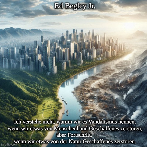 Bild: Peter van Geest AI. Bedeutung: Dieses Zitat ist eine scharfe Kritik an unserer paradoxen Haltung gegenüber Zerstörung: Wenn jemand ein Gebäude, ein Kunstwerk oder ein Denkmal (von Menschenhand geschaffen) zerstört, bezeichnen wir dies als Vandalismus und betrachten es als verwerflich. Wenn wir jedoch Wälder abholzen, Naturgebiete zerstören, Flüsse verschmutzen oder Ökosysteme zerstören (von der Natur geschaffen), bezeichnen wir dies oft als „Fortschritt” oder „Entwicklung”. Quelle: Ed Begley Jr., US-amerikanischer Schauspieler und Umweltaktivist.