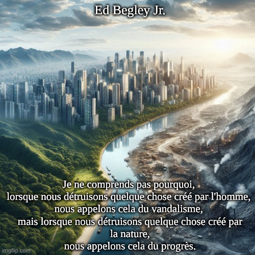 Je ne comprends pas pourquoi, lorsque nous détruisons quelque chose créé par l’homme, nous appelons cela du vandalisme, mais lorsque nous détruisons quelque chose créé par la nature, nous appelons cela du progrès.