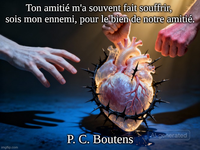 Image: Peter van Geest AI. Signification : évoque la douleur que peut engendrer l’amitié et le dilemme qui consiste parfois à prendre ses distances par amour. C’est un plaidoyer en faveur du sacrifice : en devenant ennemi, on peut espérer protéger son amitié et soi-même. Cela s’inscrit dans la thématique de Boutens, qui traite de l’abandon sensible et des expériences ambivalentes de l’attachement et de la perte. Cette réflexion poétique montre que la véritable amitié n’apporte pas seulement du bonheur, mais aussi de la douleur et des sacrifices. Parfois, par amour, il est nécessaire de se retirer afin que l’autre, et soi-même, puisse guérir. C’est « pour le bien de l’amitié ». Source : La citation en question trouve son origine dans la tradition poétique de Boutens, qui explorait régulièrement la tension entre proximité et distance dans l’amitié et l’amour. Son œuvre reflète la vulnérabilité inhérente à l’intimité et le désir paradoxal de distance pour protéger le cœur fragile. Bien que le poème exact dont est tirée cette phrase ne soit pas mentionné dans les résultats de recherche, les descriptions de son œuvre et les analyses littéraires indiquent que Boutens écrit souvent de cette manière sur l’amitié, par exemple dans « Liber amicorum » et dans ses réflexions sur le chant d’Egidius. Parfois, à tort, attribué à William Blake.