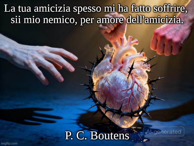 Immagine: Peter van Geest AI. Significato: descrive il dolore che può derivare dall’amicizia e il dilemma che a volte l’amore richiede di prendere le distanze. È un appello al sacrificio: diventando nemici, si spera di proteggere l’amicizia e se stessi. Ciò si inserisce nella tematica di Boutens della resa sensibile e delle esperienze ambivalenti di legame e perdita. Questo ragionamento poetico mostra che la vera amicizia non porta solo felicità, ma anche dolore e sacrifici. A volte è necessario allontanarsi per amore, in modo che l’altro, e anche tu stesso, possiate guarire. Questo è “per il bene dell’amicizia”. Fonte: La citazione in questione trova la sua origine nella tradizione poetica di Boutens, che esplorava regolarmente il campo di tensione tra vicinanza e distanza nell’amicizia e nell’amore. Il suo lavoro riflette sulla vulnerabilità che l’intimità comporta e sul paradossale desiderio di distanza per proteggere il cuore vulnerabile. Sebbene il poema esatto da cui proviene questa frase non sia menzionato nei risultati di ricerca, le descrizioni della sua opera e le analisi letterarie indicano che Boutens scrive spesso in questo modo sull’amicizia, ad esempio in “Liber amicorum” e nelle riflessioni sull’Egidiuslied. A volte, erroneamente, attribuito a William Blake.