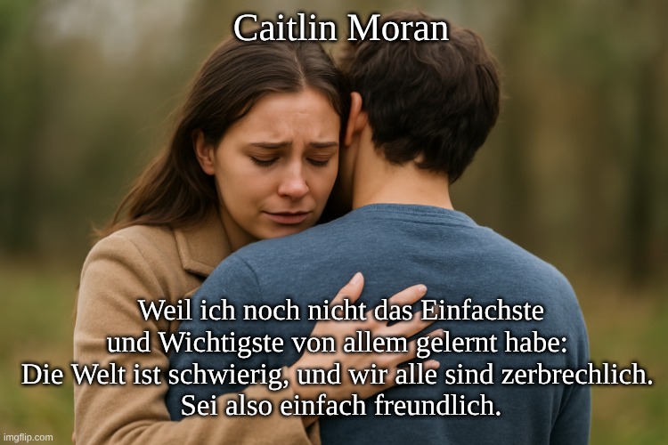 Bild: Peter van Geest AI. Bedeutung: Dieser Satz hat eine Art humanistischen Kern: Anerkennung der Schwierigkeit des Daseins + Anerkennung unserer gemeinsamen Verletzlichkeit = Grund, freundlich zu sein. Quelle: How to Be a Woman (2011) und How to Build a Girl (2014) – Caitlin Moran.