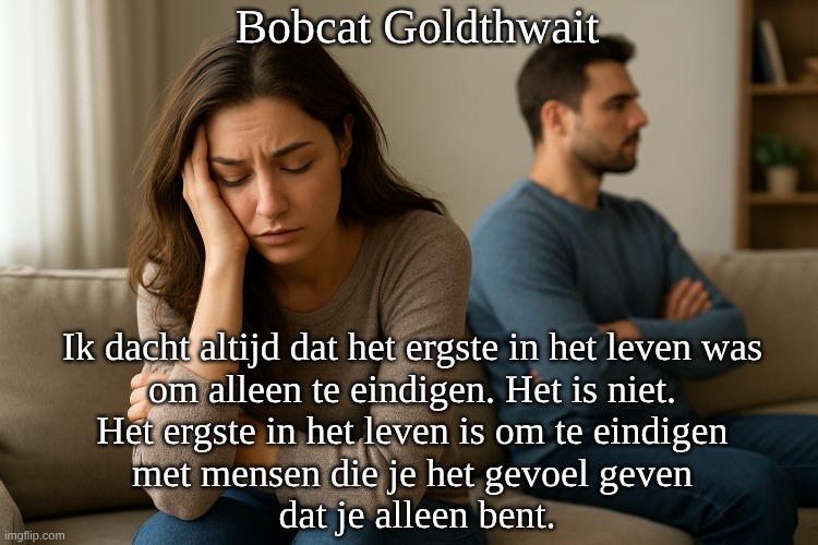 Afbeelding: Peter van Geest AI. Betekenis: Men denkt vaak dat alleen zijn (geen mensen om je heen) het ergste is. Uiteindelijk blijkt dat het nog pijnlijker is om omringd te zijn door mensen, maar tóch een diep gevoel van eenzaamheid te ervaren. Het gaat dus niet alleen om fysieke eenzaamheid, maar vooral om emotionele eenzaamheid: je kunt je alleen voelen temidden van anderen. Het citaat belicht het idee dat relaties of vriendschappen je niet automatisch beschermen tegen eenzaamheid als die relaties leeg, koud of niet verbindend zijn. Oorsprong: de zin uit de film World’s Greatest Dad (2009), waarin Robin Williams de rol “Lance Clayton” speelt. De zin is geschreven door Bobcat Goldthwait, die ook de film schreef en regisseerde. Omdat het (foutief) vaak aan Robin Williams wordt toegeschreven, is het extra bekend: zijn imago als grappig, warm, maar ook gevoelig acteur versterkt de impact van de uitspraak.