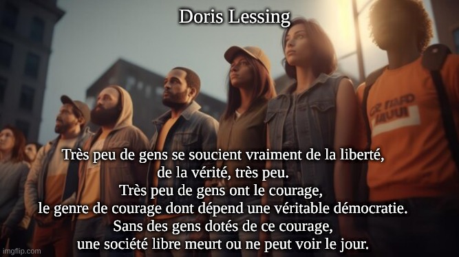 Image: Peter van Geest AI. Signification : Sans citoyens prêts à prendre des risques personnels pour défendre leurs principes, une démocratie peut facilement dégénérer en une forme creuse dans laquelle les gens renoncent à leurs libertés au profit de la sécurité, du confort ou de la conformité. Source : Doris Lessing. Elle a prononcé ces mots lors d’un discours en 1986.