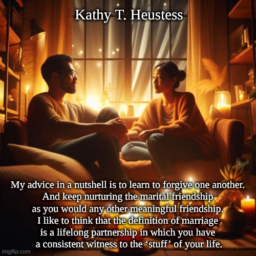 My advice in a nutshell is to learn to forgive one another. And keep nurturing the marital friendship as you would any other meaningful friendship. I like to think that the definition of marriage is a lifelong partnership in which you have a consistent witness to the ‘stuff’ of your life.