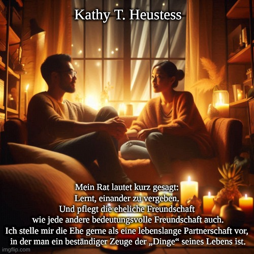 Bild: Peter van Geest AI. Bedeutung: Das Zitat beschreibt die Ehe als lebenslange Bindung, die auf Vergebung und Freundschaft beruht. Es legt nahe, dass Ehepartner Vergebung bewusst als erlernte Gewohnheit pflegen und ihre eheliche Freundschaft bewusst hegen sollten. Der Begriff des „beständigen Zeugnisses“ impliziert, dass die Ehe im Alltag gelebt wird, wo das gemeinsame Leben zum Zeugnis der Verbundenheit wird. Quelle: Kathy T. Heustess wird als Autorin genannt. Das Zitat ist wahrscheinlich eine niederländische Übersetzung eines englischen Ratschlags, den sie in einem Beratungskontext (z. B. in einer Gruppensitzung, einem Vortrag oder einem persönlichen Gespräch) gab. Dieses Konzept deckt sich mit ihrem Rat: „Die eheliche Beziehung ist die wichtigste Beziehung im Zuhause.“
