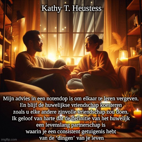 Afbeelding: Peter van Geest AI. Betekenis: Het citaat presenteert het huwelijk als een levenslange verbintenis waarin vergeving en vriendschap centraal staan. Het suggereert dat echtgenoten bewust vergeving moeten cultiveren als een aangeleerde gewoonte en hun huwelijkse vriendschap bewust moeten koesteren. Het concept van ‘consistent getuigenis’ impliceert dat het huwelijk wordt beleefd in de alledaagse momenten, waarin jullie leven samen een getuigenis wordt van jullie gedeelde verbintenis. Bron: Kathy T. Heustess wordt genoemd als auteur. Het citaat is waarschijnlijk een Nederlandse vertaling van Engels advies dat ze heeft gegeven in een counseling context (bijv. in een groepssessie, presentatie of persoonlijk gesprek). Dit concept komt overeen met haar advies: “The marital relationship is the primary relationship in the home”