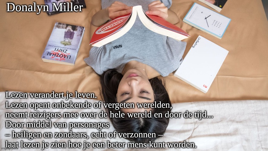 Foto: www.metronieuws.nl. Betekenis: Lezen is transformerend : lezen kan je blik verruimen, je gedachten veranderen, je wereld groter maken. Lezen opent werelden: via boeken reis je — letterlijk of figuurlijk — naar andere tijden, culturen, geschiedenis, denkwerelden. Je krijgt toegang tot ervaringen en perspectieven die je in je eigen leven misschien nooit zou tegenkomen. Lezen als ontsnapping én verrijking: lezen buiten het schoolse kader geeft vrijheid; het is een manier om je eigen leren te bepalen en op je eigen tempo. Lezen als morele en menselijke vorming: Via fictie of waargebeurde verhalen leer je over menselijkheid, fouten, levenslessen — het kan je empathie geven, je moreel besef aanscherpen, je eigen keuzes en waarden doen bevragen. Bron: The Book Whisperer: Awakening the Inner Reader in Every Child – Donalyn Miller