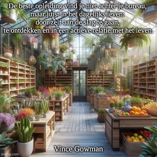 Afbeelding: Peter van Geest AI. Betekenis: Pleidooi tegen puur theoretisch, mentaal of afstandelijk leren. “Achter je bureau” staat hier ook voor een veilige, maar passieve en afgeschermde houding ten opzichte van het leven. Het echte “gymnasium” (de beste leerschool) is het leven zelf, met al zijn praktijk, ontmoetingen, successen en tegenslagen. Sleutelwoorden zijn actie (“zelf aan de slag gaan”), nieuwsgierigheid (“ontdekken”) en betrokkenheid (“actieve relatie met het leven”). Er wordt benadrukt dat wijsheid, veerkracht en inzicht niet uit boeken alleen komen, maar worden gesmeed in de interactie met de realiteit. Het gaat om leren door te leven en leven door te leren. Bron: “Het Gymnasium van het Leven” (2009) door Vince Gowman (ook wel Vincent Gowman).
