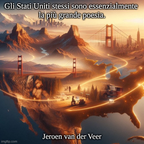 Immagine: Peter van Geest AI. Significato: Gli Stati Uniti, attraverso la loro storia, la loro diversità e il loro settore dei media e dell’intrattenimento, sono una sorta di opera d’arte vivente e in continua evoluzione. Come una poesia, si compone di molti versi, metafore e temi che insieme creano un insieme potente ed emozionante. Sottolinea sia la bellezza che la complessità della società americana. Fonte: giornalista olandese Jeroen van der Veer. Ne ha parlato in un editoriale (12 maggio 2015) in cui descriveva gli Stati Uniti come un'”opera d’arte vivente e in continua evoluzione”, da qui il paragone con una grande poesia. La citazione non è di Walt Whitman, come spesso si suggerisce.