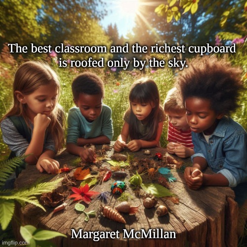 Image: Peter van Geest AI. Meaning: Nature is the best learning environment: Outdoor learning offers richer and more authentic experiences than a traditional classroom. Nature offers endless learning resources: The “richest larder” refers to the abundance of natural materials, phenomena, and experiences that nature has to offer. Freedom and space are essential: The sky as a “roof” symbolizes limitless possibilities and the freedom to explore. This vision remains relevant today and forms the basis for modern Forest Schools and outdoor education, where children learn, develop self-confidence, and follow their curiosity through direct experience with nature. Origin: In her 1919 book, “The Nursery School,” McMillan described the importance of outdoor play for children’s health and well-being. She was influenced by the educational philosopher Froebel, who based his ideas on the value of learning outdoors in nature.