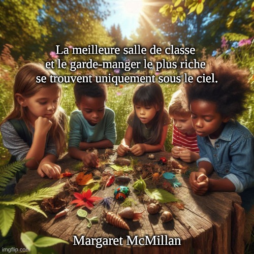 Image: Peter van Geest AI. Signification : La nature est le meilleur environnement d’apprentissage : l’apprentissage en plein air offre des expériences plus riches et authentiques qu’une salle de classe traditionnelle. La nature offre des ressources d’apprentissage infinies : le « garde-manger le plus riche » fait référence à l’abondance de matériaux, de phénomènes et d’expériences naturels qu’elle a à offrir. Liberté et espace sont essentiels : le ciel, tel un « toit », symbolise des possibilités illimitées et la liberté d’explorer. Cette vision reste pertinente aujourd’hui et constitue le fondement des écoles forestières modernes et de l’éducation en plein air, où les enfants apprennent, développent leur confiance en soi et suivent leur curiosité grâce à une expérience directe avec la nature. Origine : Dans son ouvrage de 1919, « The Nursery School », McMillan décrivait l’importance du jeu en plein air pour la santé et le bien-être des enfants. Elle était influencée par le philosophe de l’éducation Froebel, qui fondait ses idées sur la valeur de l’apprentissage en plein air, au contact de la nature.