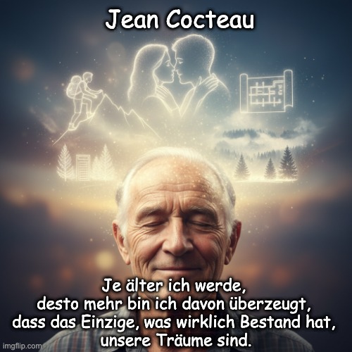 Bild: Peter van Geest AI. Bedeutung 💭: Die Aussage „Je älter ich werde, desto mehr bin ich davon überzeugt, dass nur unsere Träume wirklich Bestand haben“ berührt einen tiefgründigen philosophischen Gedanken. Vergänglichkeit des Materiellen: Mit zunehmendem Alter erlebt man oft die Flüchtigkeit von Besitz, Beziehungen, Jugend und sogar körperlichen Fähigkeiten. Vieles, was im Leben wichtig erscheint, verblasst oder verschwindet mit der Zeit. Die Kraft der Träume: Träume bezeichnen in diesem Zusammenhang nicht nur nächtliche Fantasien, sondern auch Ambitionen, Ideale, Wünsche, Hoffnungen und die menschliche Innenwelt. Diese Innenwelt, erfüllt von Träumen und Sehnsüchten, kann sich zeitlos anfühlen und unabhängig von äußeren Umständen fortbestehen. Sie geben Orientierung und Sinn und können Trost und Inspiration spenden, selbst wenn die Realität unerbittlich ist. Eine Form der Unsterblichkeit: In gewisser Weise deuten Träume auf eine Form der Unsterblichkeit hin. Sie können uns voranbringen, selbst nach Rückschlägen, und durch Kunst, Innovation oder den Einfluss auf andere ein Vermächtnis hinterlassen. Kurz gesagt, betont die Aussage den inneren Wert und die Beständigkeit unserer inneren Welt und unserer Bestrebungen im Gegensatz zur Vergänglichkeit der physischen und äußeren Welt. Urheber und Autor:Jean Cocteau ✅ (1889–1963). Jean Cocteau war ein einflussreicher französischer Künstler und Intellektueller. Er war ein vielseitiges Talent: Dichter, Dramatiker, Filmemacher, Romancier, Maler und Designer. Sein Werk ist oft von surrealistischen Elementen, der Erforschung der Identität und tiefer Selbstreflexion geprägt. Er war eine Schlüsselfigur der Pariser Avantgarde des 20. Jahrhunderts. Der Satz passt perfekt zu seinem Œuvre und seiner Tendenz, die Grenze zwischen Realität und Fantasie zu verwischen und die Kraft des menschlichen Geistes und der Kreativität hervorzuheben.