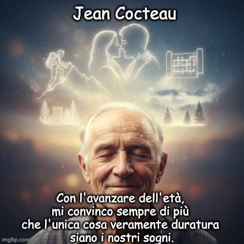 Immagine: Peter van Geest AI. Significato 💭: L’affermazione “Invecchiando, mi convinco sempre di più che l’unica cosa veramente duratura siano i nostri sogni” tocca un concetto filosofico profondo. La transitorietà della materia: con l’avanzare dell’età, si sperimenta spesso la natura effimera dei beni materiali, delle relazioni, della giovinezza e persino delle capacità fisiche. Molte cose che sembrano importanti nella vita finiscono per svanire o scomparire. Il potere dei sogni: in questo contesto, i sogni non si riferiscono solo alle fantasie notturne, ma anche ad ambizioni, ideali, desideri, speranze e al mondo interiore dell’essere umano. Questo mondo interiore, pieno di sogni e aspirazioni, può sembrare qualcosa di senza tempo che persiste indipendentemente dalle circostanze esterne. Forniscono direzione e significato e possono essere fonte di conforto o ispirazione, anche quando la realtà è implacabile. Una forma di immortalità: in un certo senso, i sogni suggeriscono una forma di immortalità. Possono spingerci avanti, anche dopo le battute d’arresto, e possono lasciare un’eredità attraverso l’arte, l’innovazione o l’influenza sugli altri. In breve, l’affermazione sottolinea il valore intrinseco e la durata del nostro mondo interiore e delle nostre aspirazioni, in contrasto con la transitorietà del mondo fisico ed esteriore. Origine e autore:Jean Cocteau ✅ (1889-1963). Jean Cocteau è stato un influente artista e intellettuale francese. Era un talento poliedrico: poeta, drammaturgo, regista, romanziere, pittore e designer. La sua opera è spesso caratterizzata da elementi surrealisti, esplorazione dell’identità e profonda introspezione. Fu una figura chiave della scena d’avanguardia parigina del XX secolo. La frase si adatta perfettamente alla sua opera e alla sua tendenza a sfumare il confine tra realtà e fantasia, e a enfatizzare la forza dello spirito umano e della creatività.