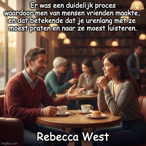 Afbeelding: Peter van Geest AI. Betekenis: Vriendschap opbouwen: Het citaat legt de nadruk op het proces van het ontwikkelen van vriendschappen door middel van communicatie. Luisteren en praten: Het benadrukt dat echte connecties voortkomen uit het investeren van tijd in gesprekken en het luisteren naar anderen. Diepgang: Het idee is dat oppervlakkige interacties niet voldoende zijn om echte vriendschappen te vormen. Oorsprong:Context: Het citaat komt uit een bredere discussie over menselijke relaties en de complexiteit van vriendschap. Cultuur: Dit idee is een algemeen thema in veel literatuur en reflecteert de waarde van persoonlijke interacties in verschillende culturen. Auteur:Rebecca West: De auteur van het gezegde is Rebecca West, een Britse schrijfster, journalist en literair criticus. Soms wordt onterecht geopperd dat J.M. Coetzee, een Zuid-Afrikaanse auteur en Nobelprijswinnaar voor Literatuur de auteur is van dit gezegde. Rebecca West is vooral bekend om haar romans en essays, waarin ze thema’s als feminisme, politiek en sociale rechtvaardigheid verkent.
