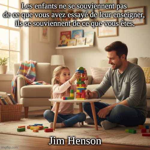 Image: Peter van Geest AI. Signification : Cette citation souligne que les enfants apprennent davantage des exemples donnés par les adultes que des leçons qui leur sont explicitement enseignées. Elle suggère que l’attitude, les valeurs et les comportements des adultes ont un impact durable sur le développement des enfants. Origine : Cette citation est souvent attribuée à Jim Henson, le célèbre marionnettiste et créateur des Muppets. Henson était connu pour ses connaissances sur l’enfance et la manière dont les enfants apprennent et se développent. Auteur : Jim Henson : Une figure influente dans les médias pour enfants, qui s’est concentrée sur la création de contenus éducatifs et divertissants pour les enfants. Résumé : Cette citation nous rappelle que notre rôle de modèle est essentiel dans l’éducation des enfants. Elle nous invite à réfléchir à notre comportement et aux valeurs que nous transmettons à la jeune génération. 🌟