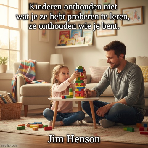 Afbeelding: Peter van Geest AI. Betekenis: Het citaat benadrukt dat kinderen meer leren van de voorbeelden die volwassenen geven dan van de lessen die expliciet aan hen worden onderwezen. Het suggereert dat de houding, waarden en gedragingen van volwassenen een blijvende impact hebben op de ontwikkeling van kinderen. Oorsprong: Dit gezegde wordt vaak toegeschreven aan Jim Henson, de beroemde poppenspeler en maker van de Muppets. Henson was bekend om zijn inzichten in de kindertijd en de manier waarop kinderen leren en zich ontwikkelen. Auteur:  Jim Henson: Een invloedrijke figuur in de kindermedia, die zich richtte op het creëren van educatieve en vermakelijke content voor kinderen.