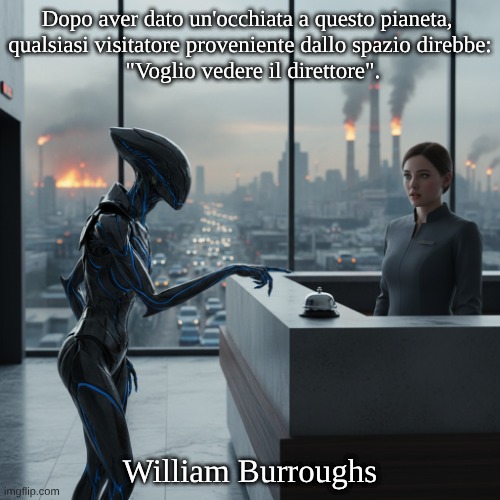 Immagine: Peter van Geest AI. Significato: 💡 L’immagine di un alieno che vuole parlare con “il manager” è ironica: il mondo sembra un’azienda mal gestita. Espone potere e responsabilità: chi è “responsabile” di sistemi che stanno fallendo in modo così evidente? Il tono è secco, malinconico e tipicamente burroughsiano: critica sociale confezionata come una battuta. Origine e fonte: 📚 Attribuzione: William S. Burroughs. Pubblicazione: Spesso citato da “The Adding Machine: Selected (or Collected) Essays” (1985). Contesto: Molte fonti collegano questa frase al saggio “The War Universe”, in cui Burroughs caratterizza la Terra come una realtà di guerra permanente. Informazioni sull’autore ✍️: William S. Burroughs è stato uno scrittore americano della Beat Generation (noto, tra le altre opere, per “Il pasto nudo”). Temi: meccanismi di controllo, dipendenza, potere, paranoia, satira e forma sperimentale.